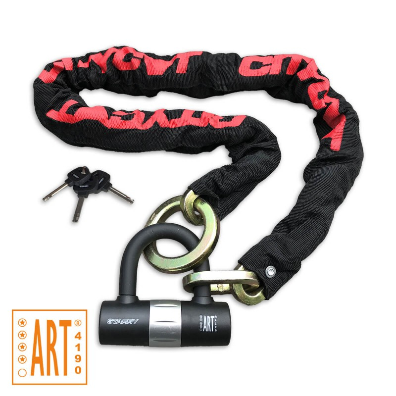 Kettingslot met U-beugel | Geschikt voor China scooters met kleine velgen Starry | Citycat kettingslot met loop en mini U-slot, deze is ook als schijfremslot te gebruiken. Van gehard staal en weerbestendig. Lengte 120 cm. Met 3 sleutels. ART-4 goedgekeurd